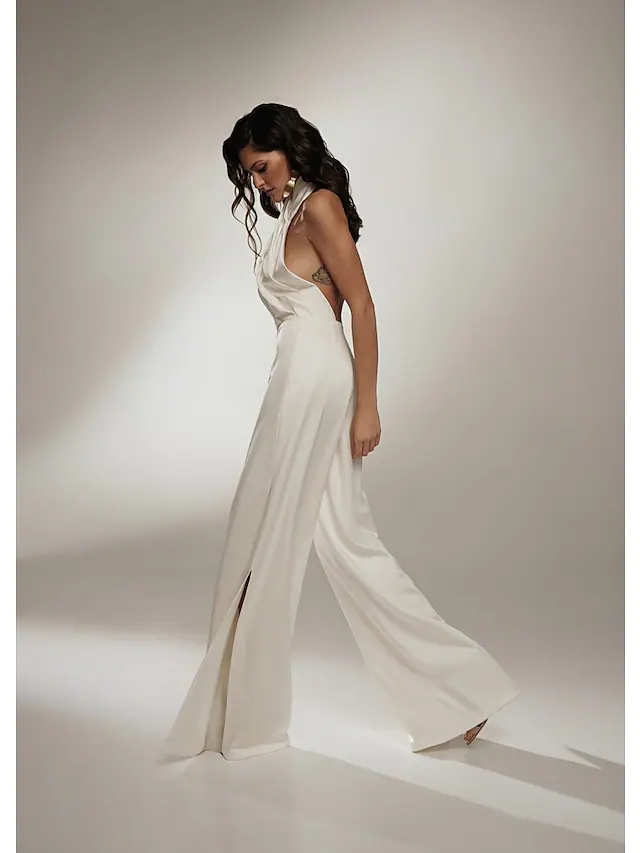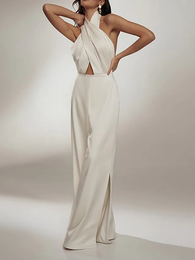 > full dress > Women's Jumpsuit Backless High Waist Solid Color Halter Neck Elegant Party Wide Leg Regular Fit Sleeveless White